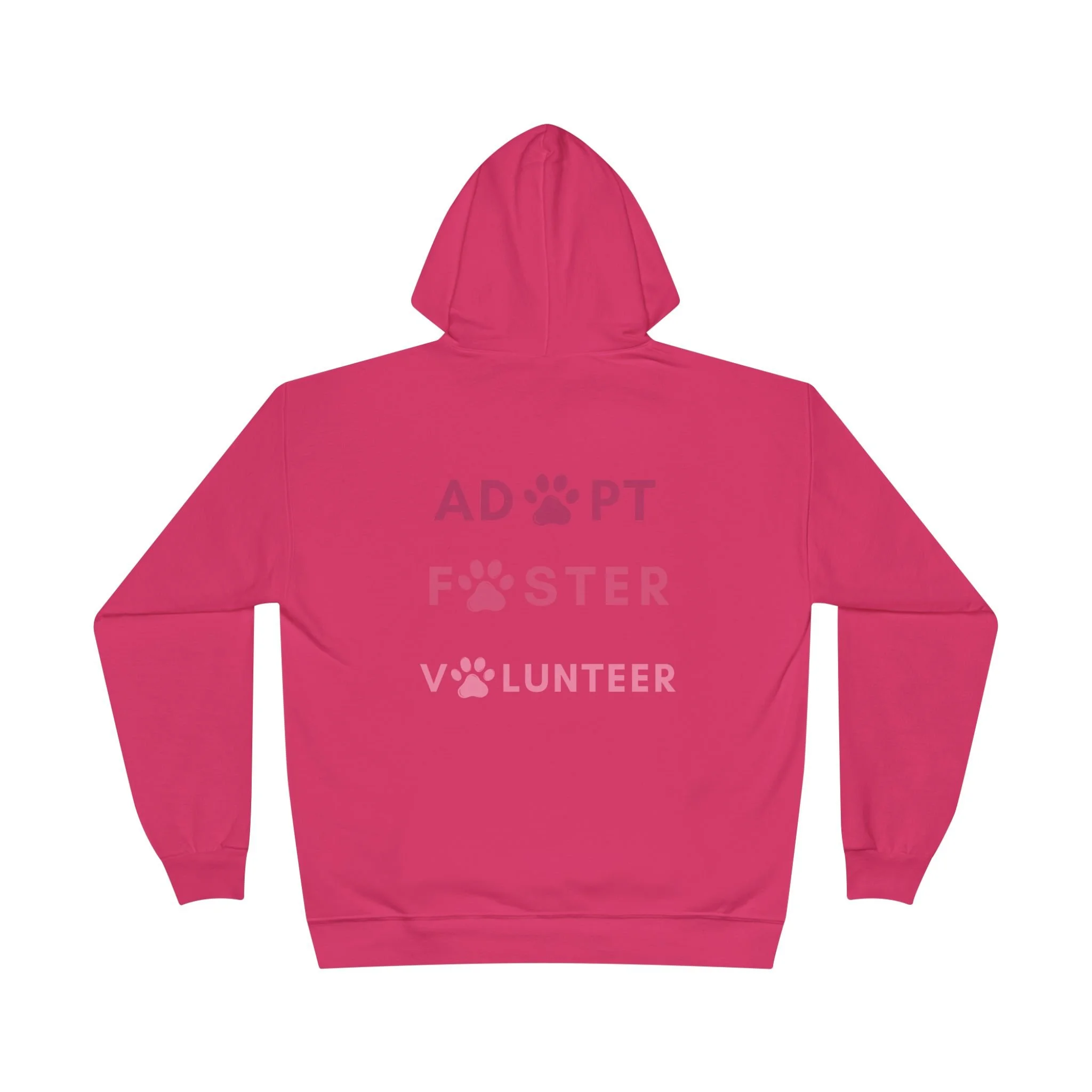 Soft, cozy, and consciously made—this hoodie quietly carries a big heart. A small pink heart emblem rests over the chest while the back speaks the mission: ADOPT, FOSTER, VOLUNTEER, accented with paw-print letters. It’s the kind of sweatshirt you reach for on cooler mornings at the shelter, during weekend adoption events, or when you’re running errands and want to share your values without saying a word. Brushed fleece inside keeps you warm; a roomy kangaroo pocket holds treats, keys, or warming hands. The tubular knit reduces waste and the fabric includes recycled polyester, so the piece feels thoughtful on and off the body. Wear it while walking pups, folding laundry for new arrivals, or meeting fellow animal lovers—this hoodie feels like community.