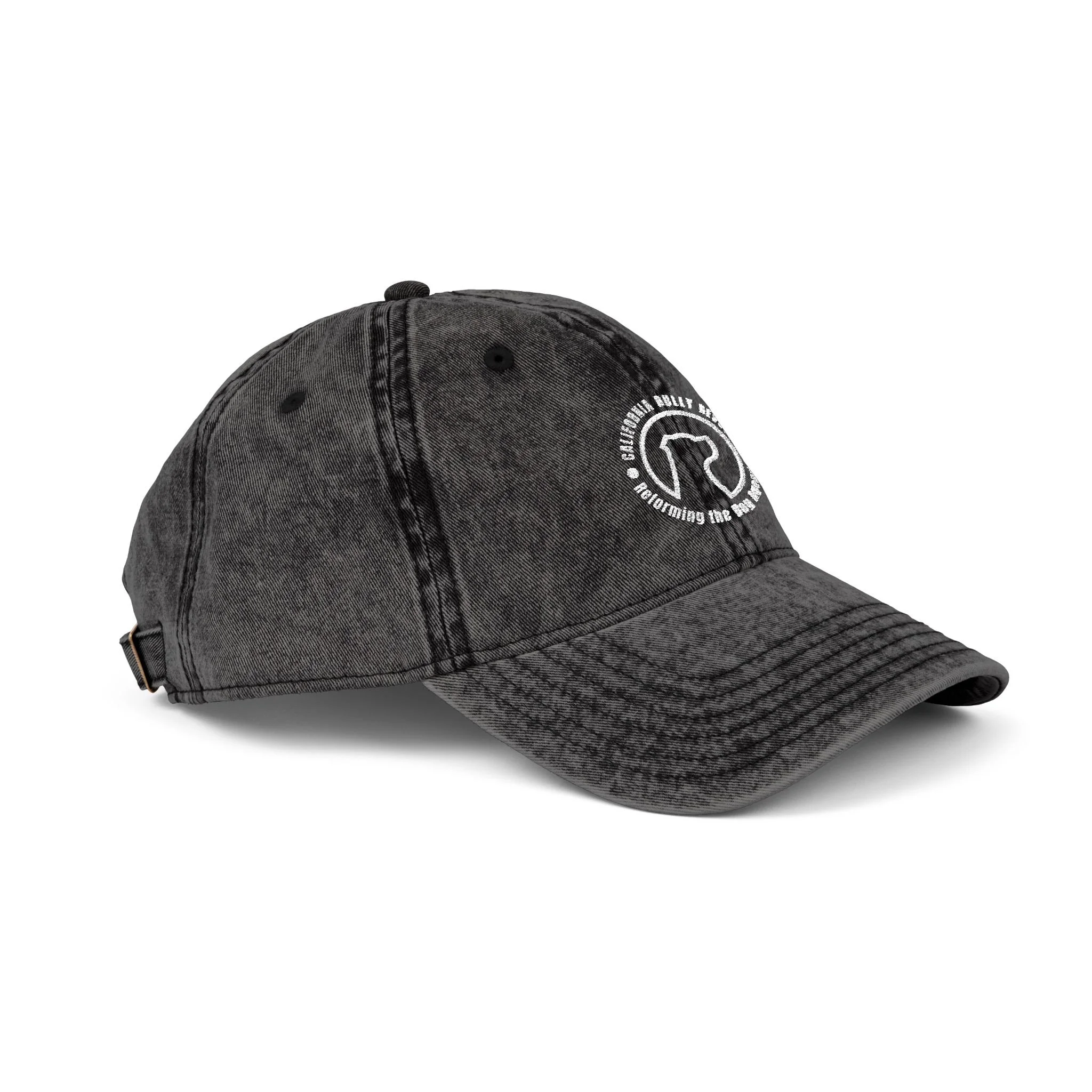 Product features - 100% cotton twill with washed-out vintage effect - 6-panel unstructured, low-profile fit with 6 sewn eyelets - White circular embroidered detail on front - Adjustable metal snap buckle with antique brass finish - Black sweatband; adult sizing; distressed variations make each piece unique